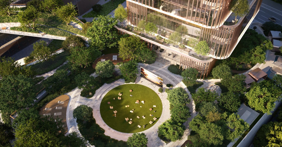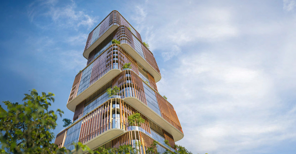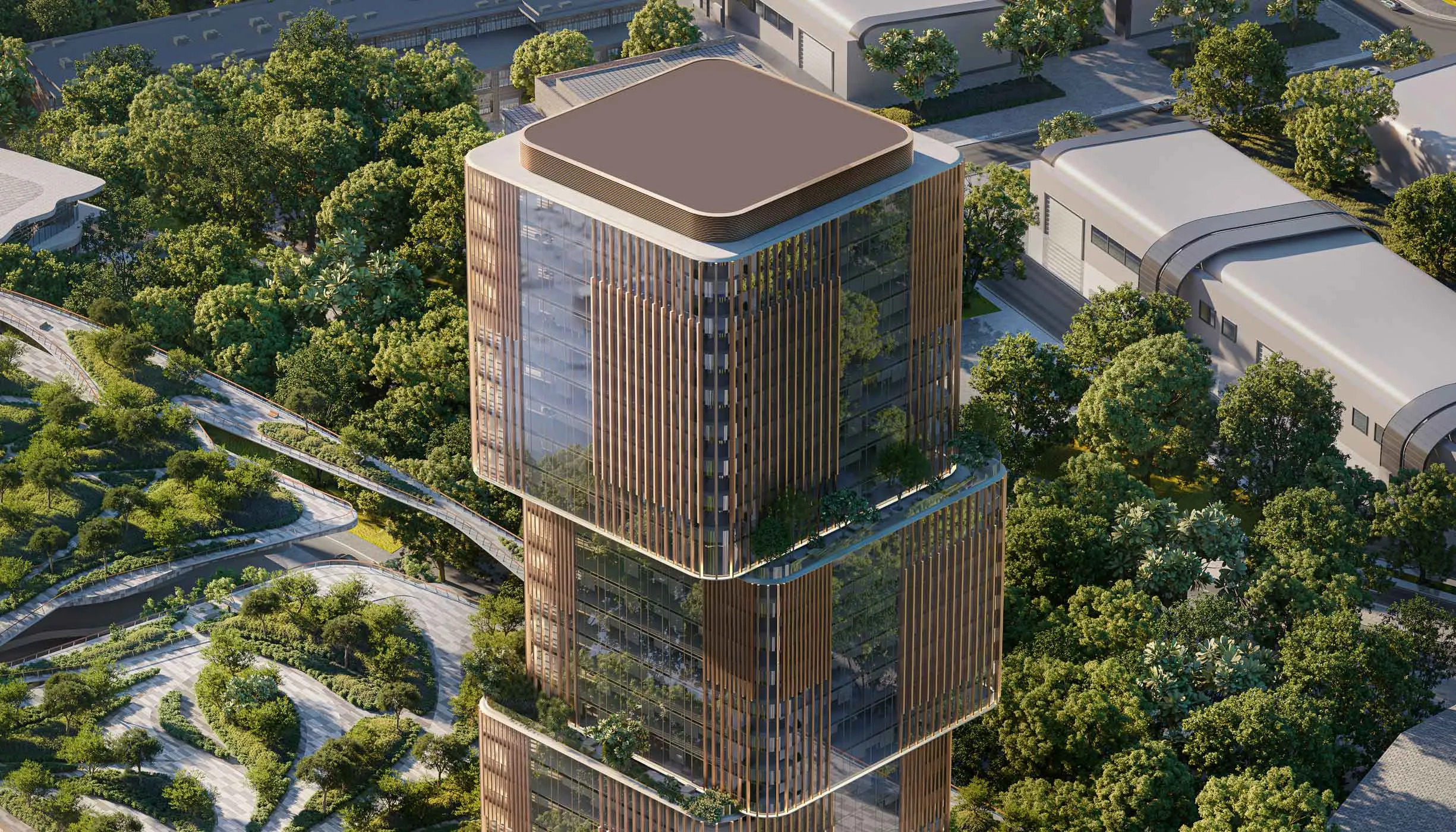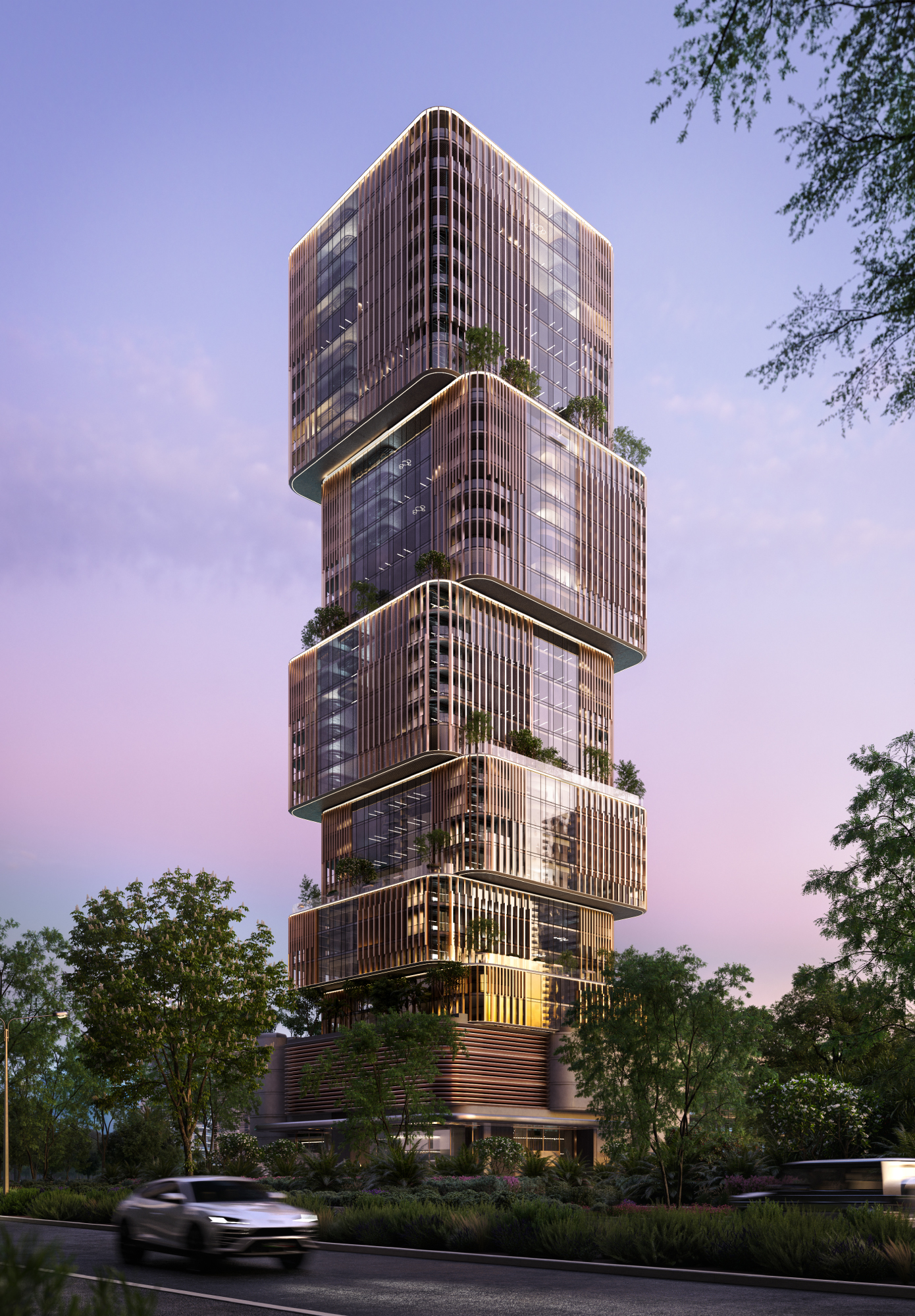 The development features 116 premium shell-and-core office units distributed across 31 floors, designed for modern business requirements.