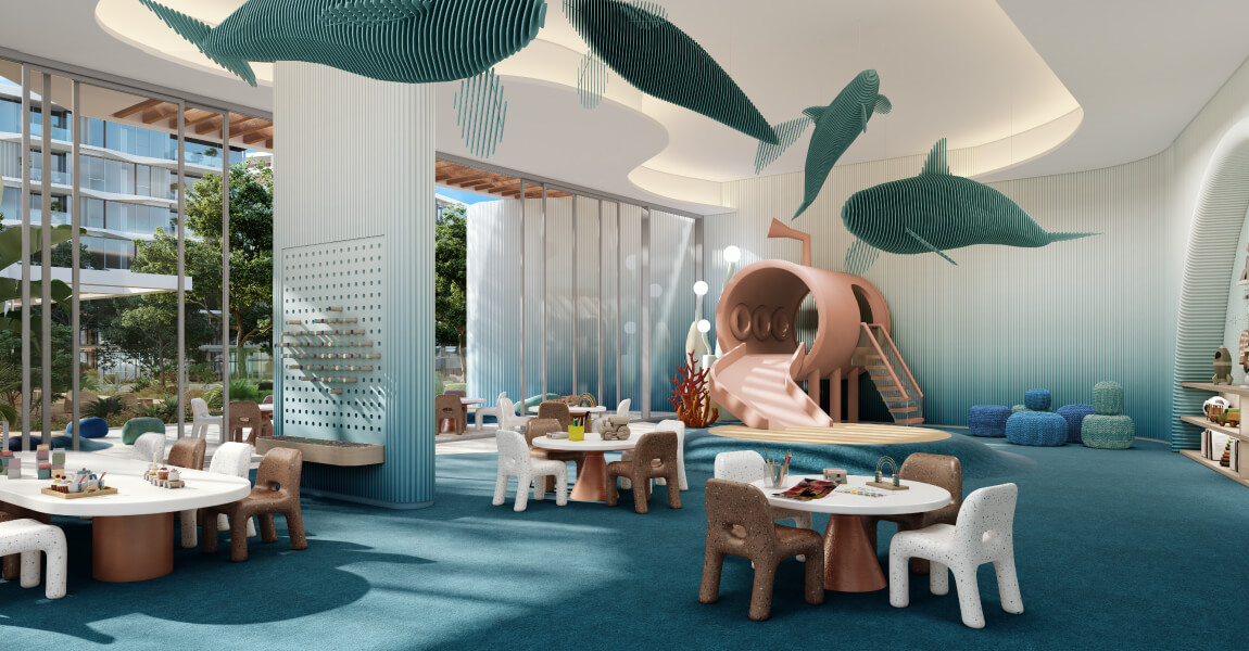 Key amenities at Palm Central Residences include an infinity pool, gym, beach cinema, kids' play areas, co-working zones, and beach lounges.